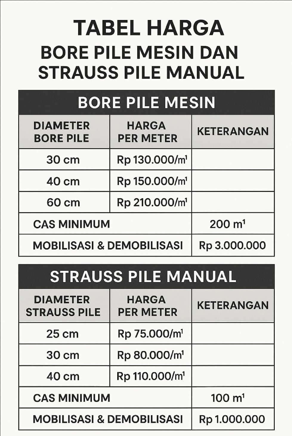 Berikut kisaran harga jasa bore pile dan strauss pile dari INDOBOREPILE. Harga dapat berubah tergantung kondisi tanah, kedalaman, dan volume pekerjaan. Namun, kami selalu memberikan estimasi transparan dan konsultasi gratis sebelum pekerjaan dimulai.